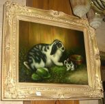 Oil on Canvas Two Rabbits in Gilt Pierced Carved Frame, Signed Rolence - 27 1/4" wide x 23 1/2" tall Oil on Canvas Two Rabbits in Gilt Pierced Carved Frame, Signed Rolence - 27 1/4" wide x 23 1/2" tall