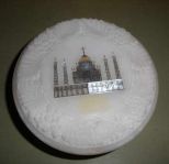 Round alabaster jewelry box with inlaid design - 3 3/4" round by 1 1/2" deep Round alabaster jewelry box with inlaid design - 3 3/4" round by 1 1/2" deep