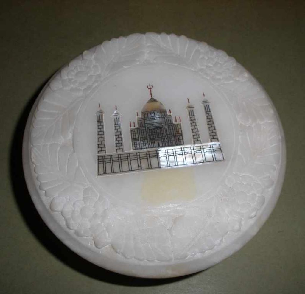 1629 Round alabaster jewelry box with inlaid design