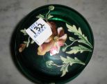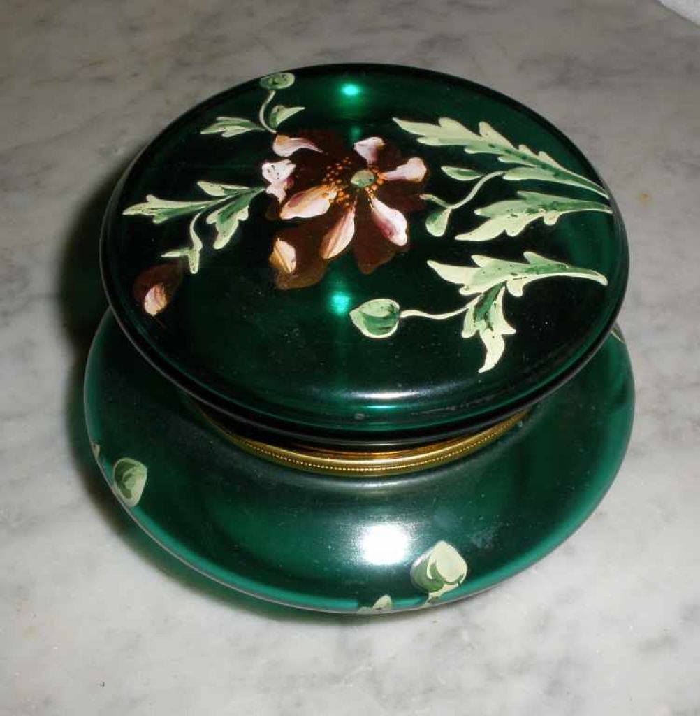 Small green hinged powder box with flowers - 4 1/2" round by 3" tall Small green hinged powder box with flowers - 4 1/2" round by 3" tall