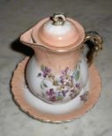 Small hand painted pitcher with underplate Victoria Austria purple flowers - pitcher is 4 1/2" width by 6" tall - plate is 5 1/4" round Small hand painted pitcher with underplate Victoria Austria purple flowers - pitcher is 4 1/2" width by 6" tall - plate is 5 1/4" round