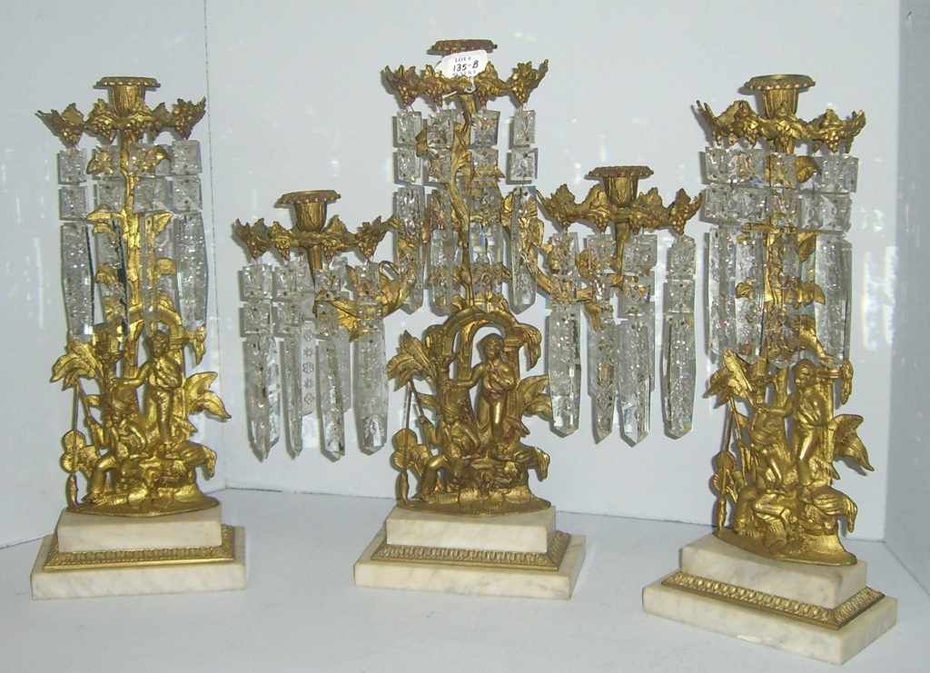 Bronze Victorian 3 Piece Girandole Set w/Boys Fishing, Engraved Prisms Bronze Victorian 3 Piece Girandole Set w/Boys Fishing, Engraved Prisms