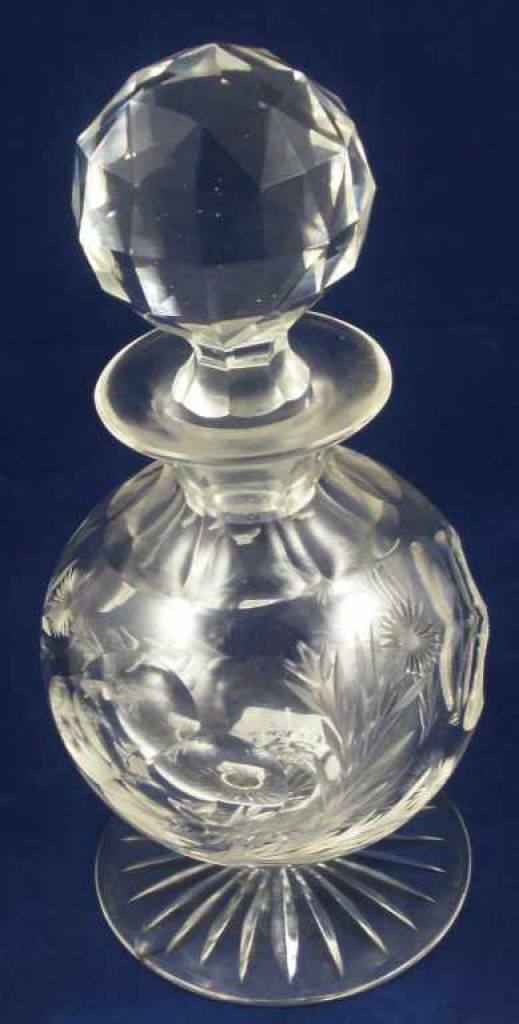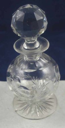 Small cut glass perfume bottle with faceted stopper - 7" tall Small cut glass perfume bottle with faceted stopper - 7" tall