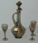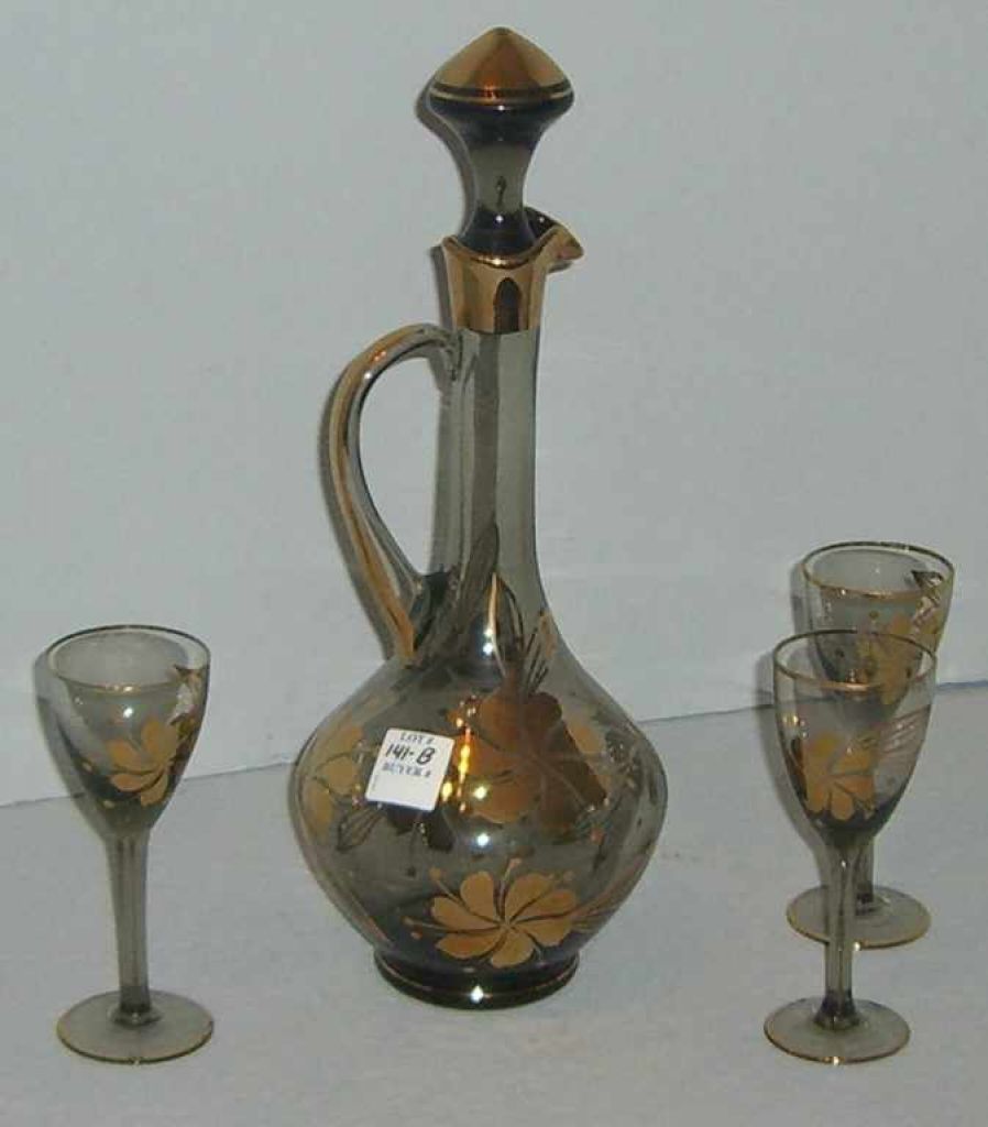 Handled Green Decanter w/Bright Gold Floral Decoration and Three Matching Glasses - 13 1/4" tall Handled Green Decanter w/Bright Gold Floral Decoration and Three Matching Glasses - 13 1/4" tall