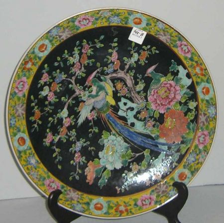 Famille Noire Black Background Decorated Charger, Yellow Floral Border w/Phoenix Birds - 14 5/8" diameter Famille Noire Black Background Decorated Charger, Yellow Floral Border w/Phoenix Birds - 14 5/8" diameter