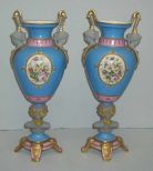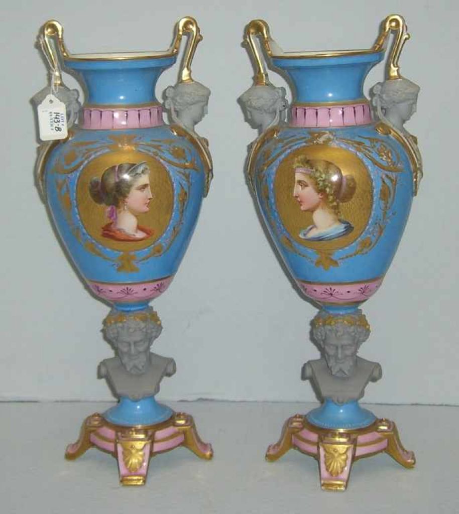 Pair of Old Paris Portrait Vases, Blue Background w/Pink and Gold Decoration and Gray Bisque Applications - 17 3/4" tall Pair of Old Paris Portrait Vases, Blue Background w/Pink and Gold Decoration and Gray Bisque Applications - 17 3/4" tall