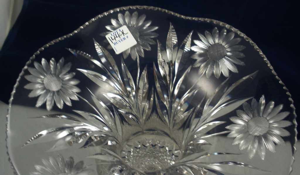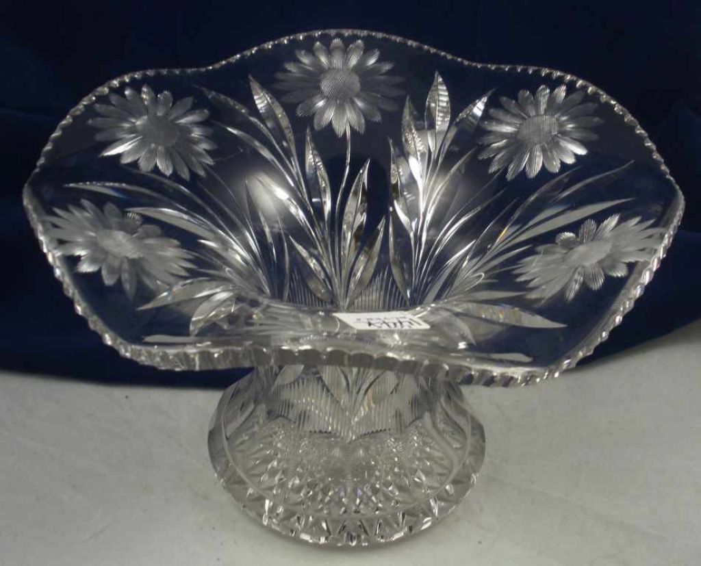 Cut glass center vase with large flared top & cut flowers - 10" round by 6" tall Cut glass center vase with large flared top & cut flowers - 10" round by 6" tall