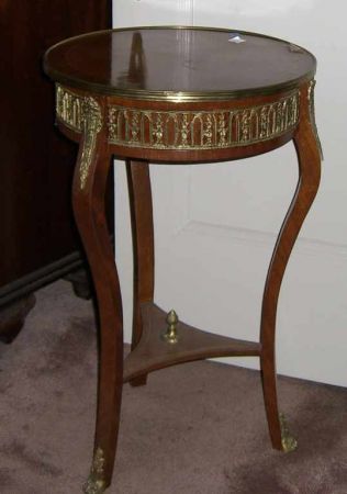 Pair of French inlaid top pedestals with gilt ormolu - 17 3/4" diameter by 29 1/2" tall Pair of French inlaid top pedestals with gilt ormolu - 17 3/4" diameter by 29 1/2" tall