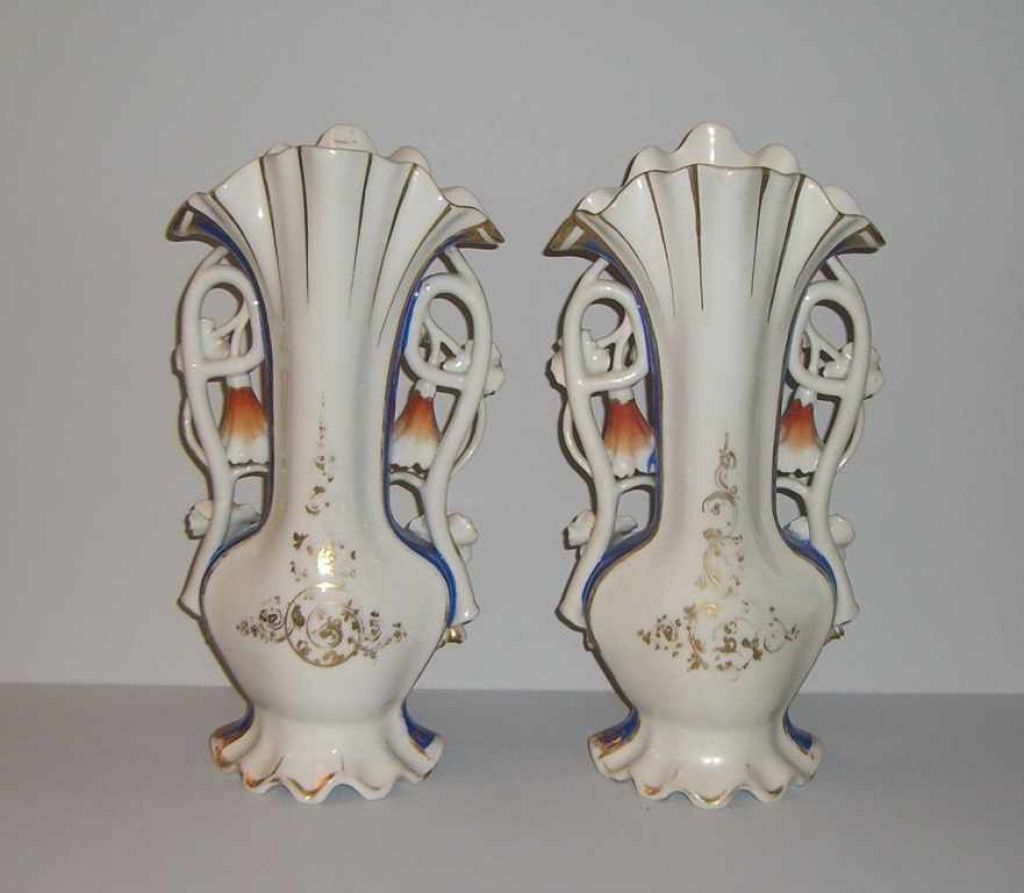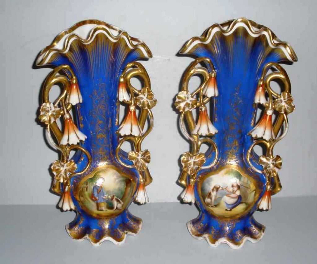 Pair of blue & gold Old Paris vases with hanging flowers. One vase is boy with dog other vase is girl with dog - 7 inches wide by 15 inches tall by 4 1/2 inches deep Pair of blue & gold Old Paris vases with hanging flowers. One vase is boy with dog other vase is girl with dog - 7 inches wide by 15 inches tall by 4 1/2 inches deep