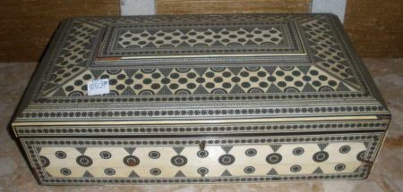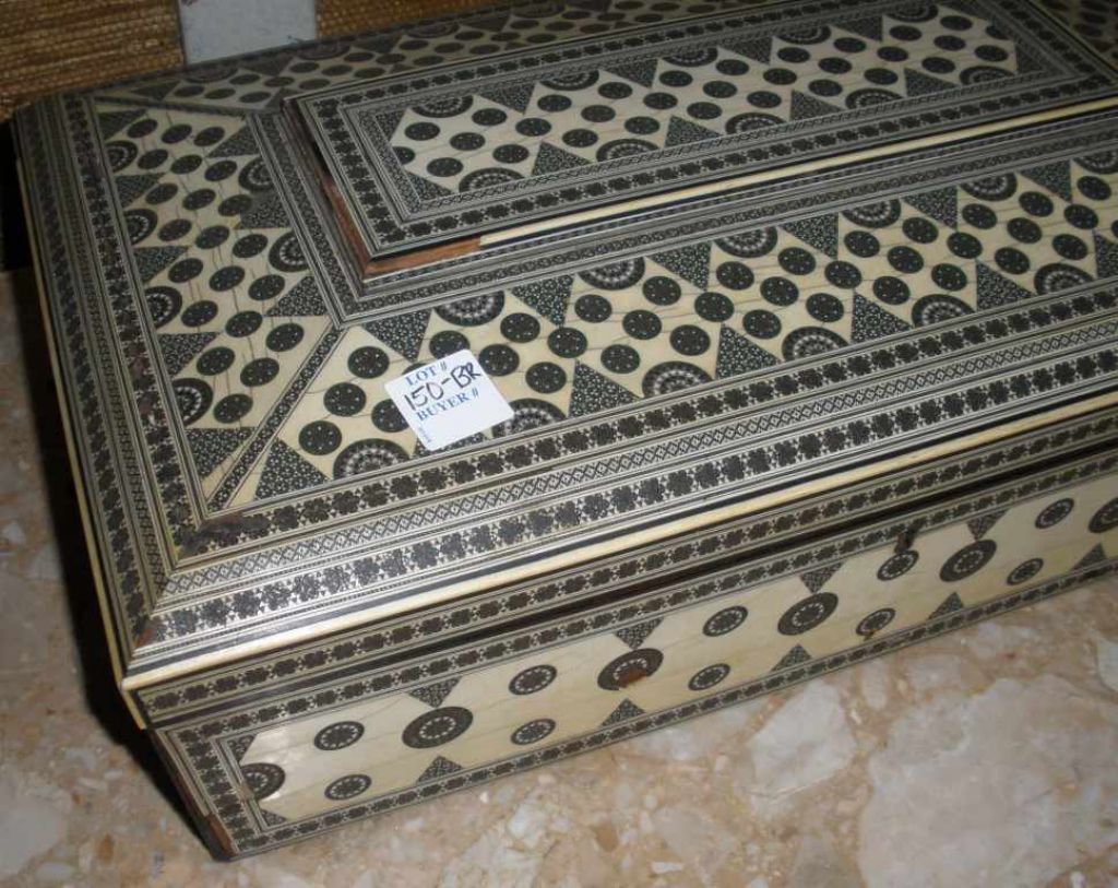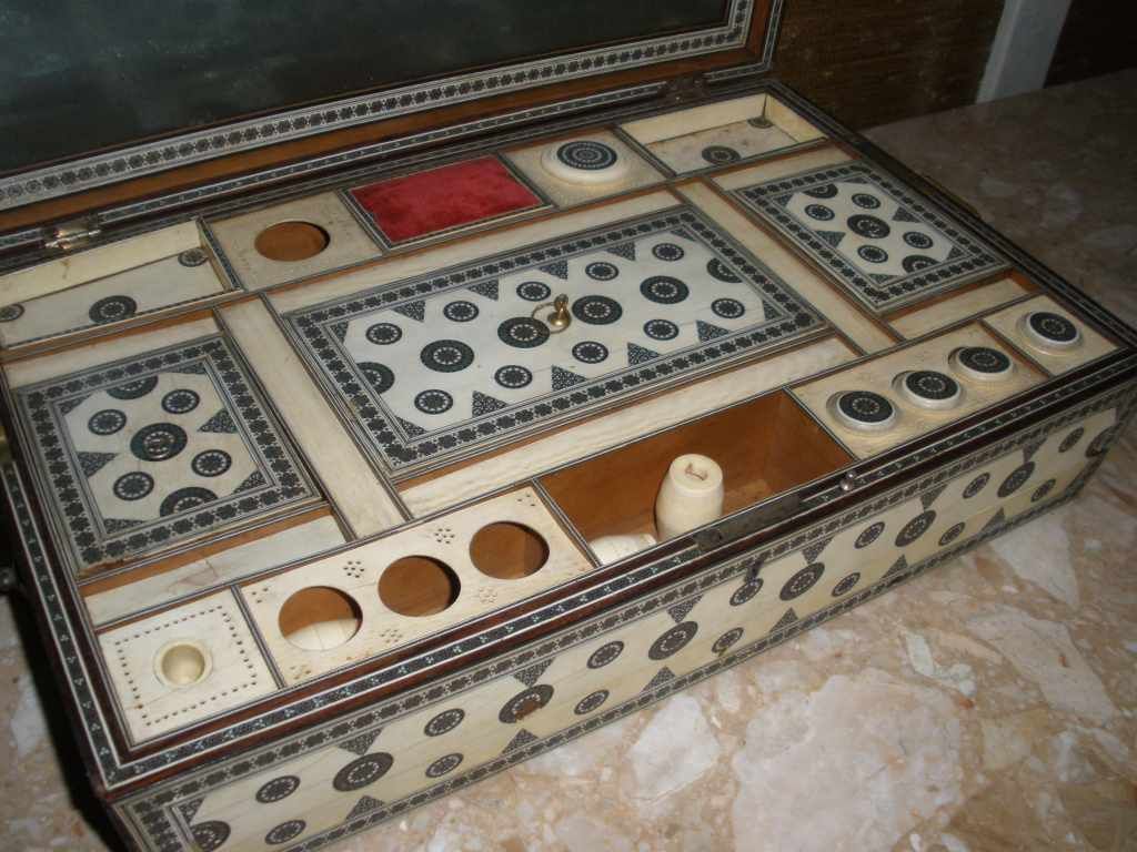Heavily inlaid nicely fitted sewing case - 17 3/8" length x 11" width Heavily inlaid nicely fitted sewing case - 17 3/8" length x 11" width