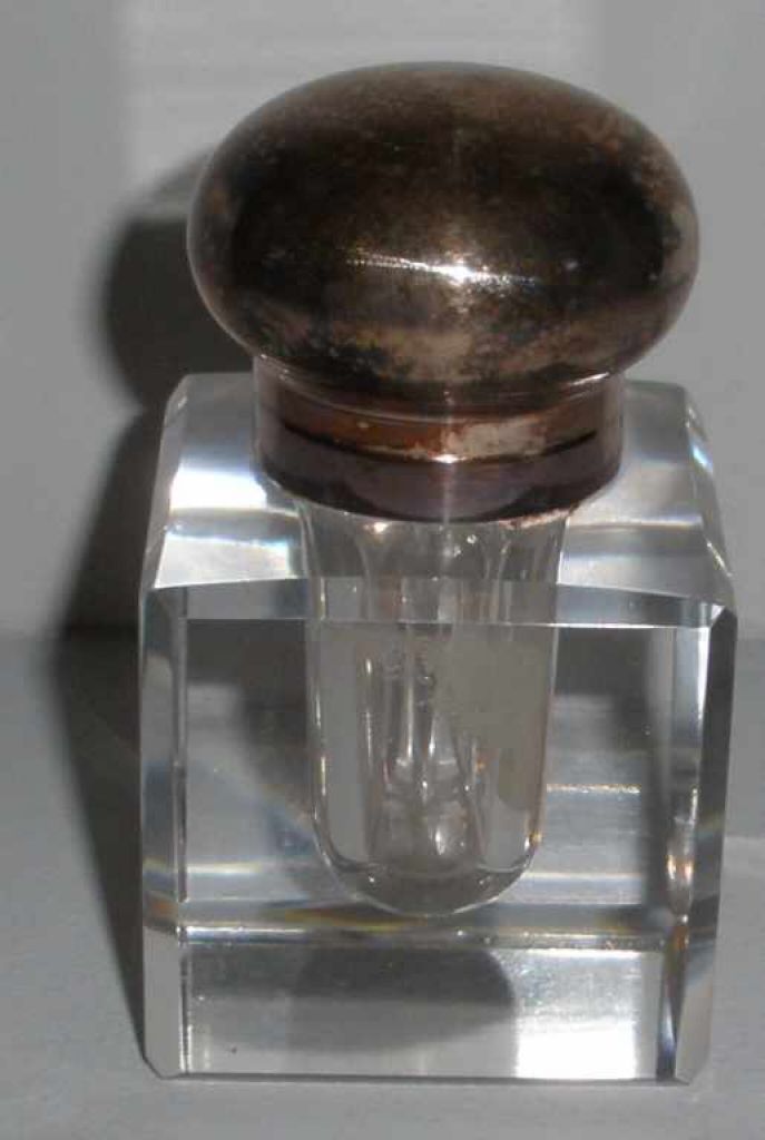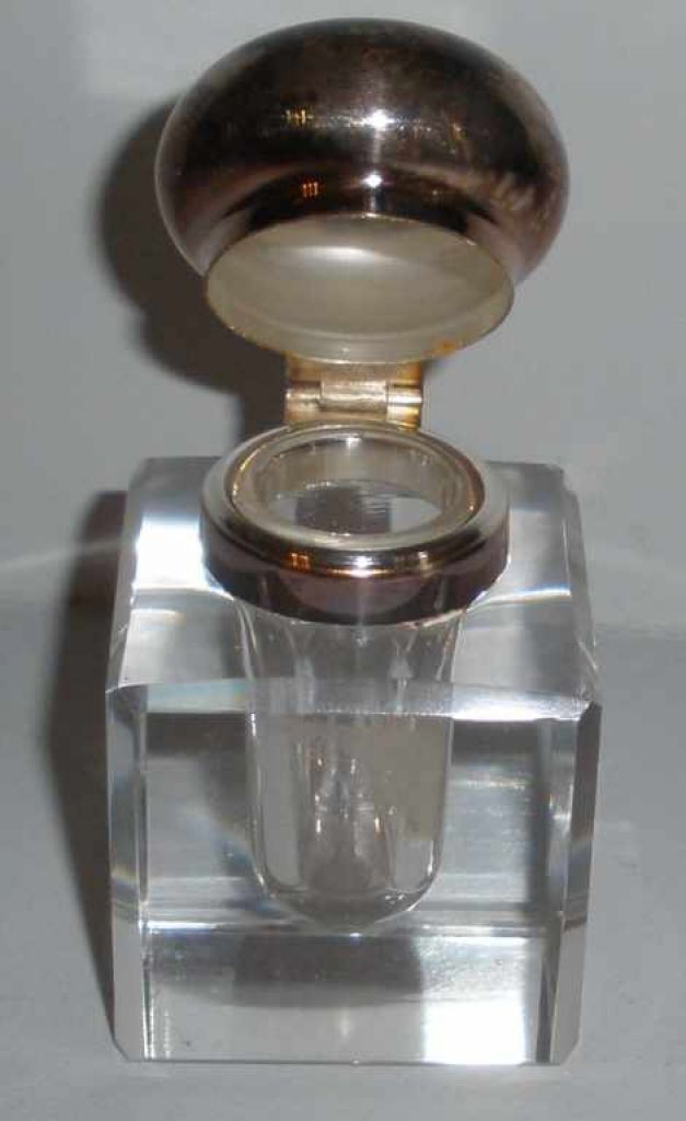 Clear crystal inkwell with silver hinged top. 1 3/4" square x 3" tall Clear crystal inkwell with silver hinged top. 1 3/4" square x 3" tall