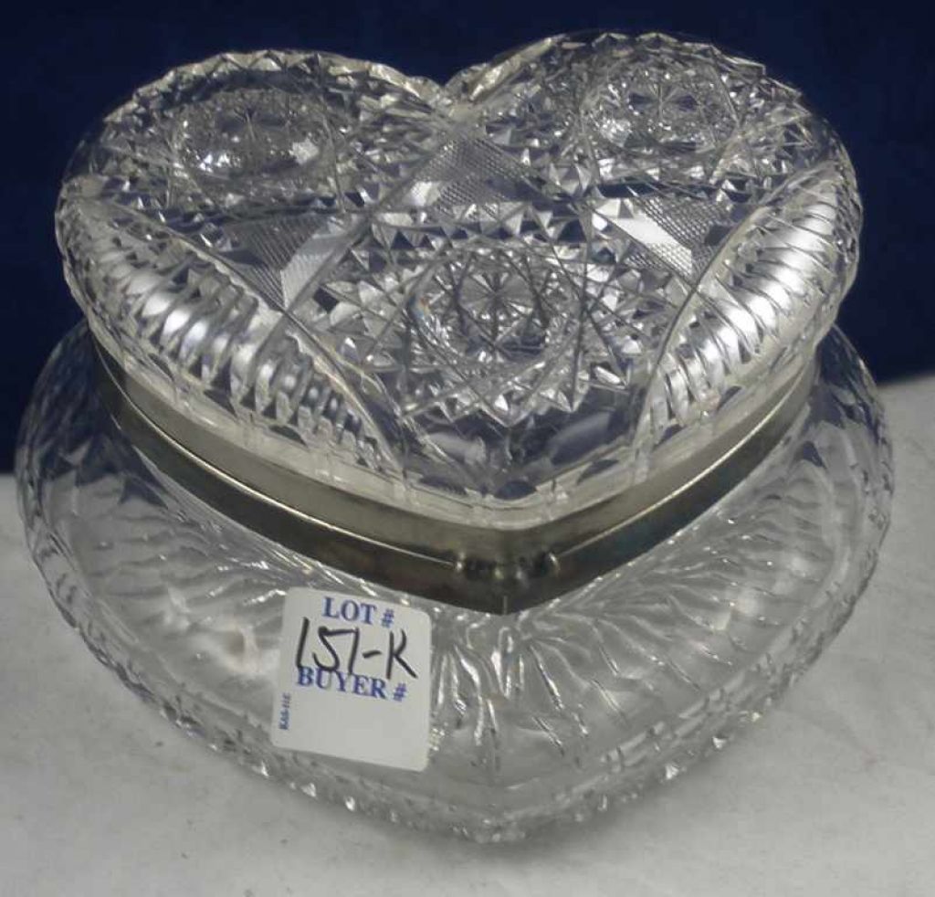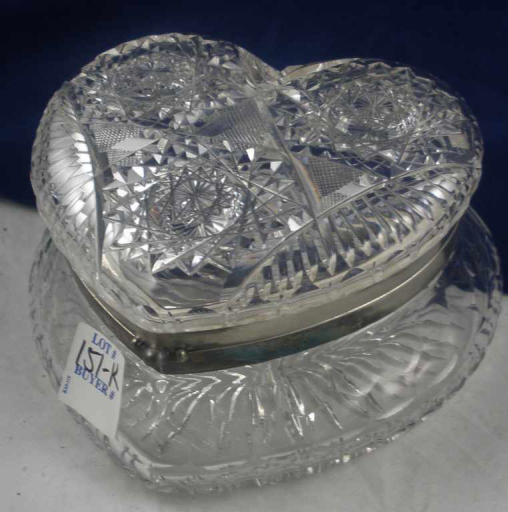 Heart shaped hinged cut glass box, hobstar top - 5 1/2" by 3" Heart shaped hinged cut glass box, hobstar top - 5 1/2" by 3"