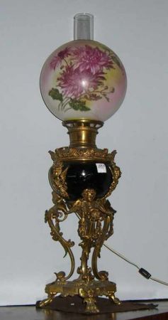 Brass & black lamp with round hand painted shade Brass & black lamp with round hand painted shade