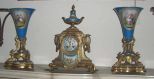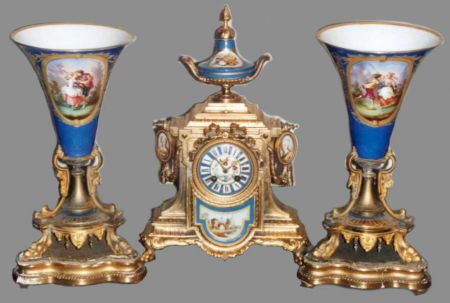 1845 3 pc gilt bronze & Sevres Porcelain Pair of Scenic Decorated Vases with Clock