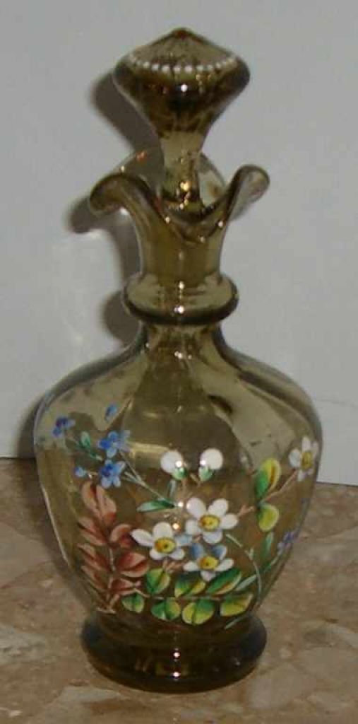 Amber cologne bottle hand painted w/tri-fold top - 6 3/4" tall Amber cologne bottle hand painted w/tri-fold top - 6 3/4" tall