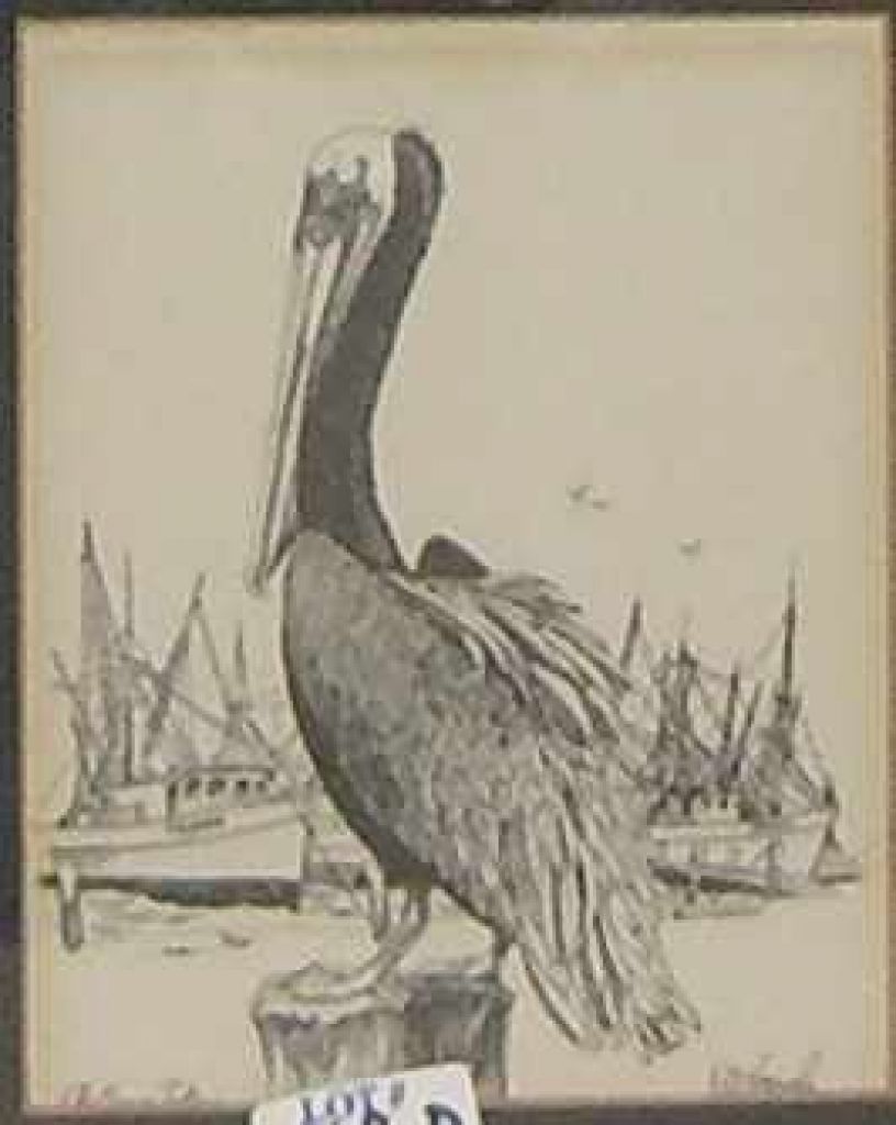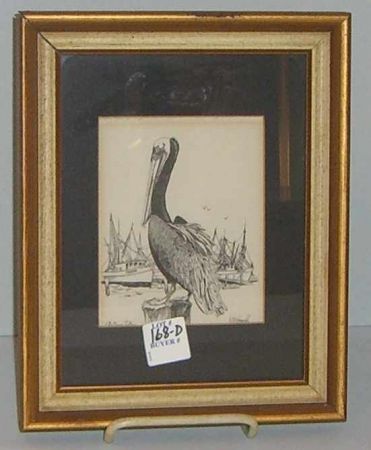Small gold framed picture of black & white pelican. Small gold framed picture of black & white pelican.
