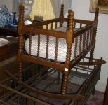 Large oak spool baby cradle on rockers with custom made mattress - 38" long by 35 1/2" wide (rockers) by 32" tall Large oak spool baby cradle on rockers with custom made mattress - 38" long by 35 1/2" wide (rockers) by 32" tall