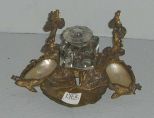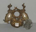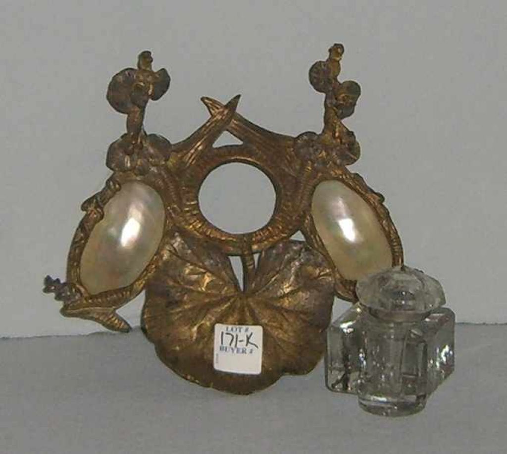 Brass leaf design inkwell with double oyster pear sides - 8" length by 6" width by 4" height Brass leaf design inkwell with double oyster pear sides - 8" length by 6" width by 4" height