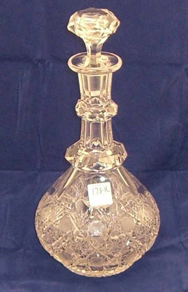 Cut glass decanter, Harvard cut, ring neck, teardrop stopper - 13" tall Cut glass decanter, Harvard cut, ring neck, teardrop stopper - 13" tall