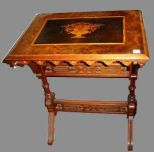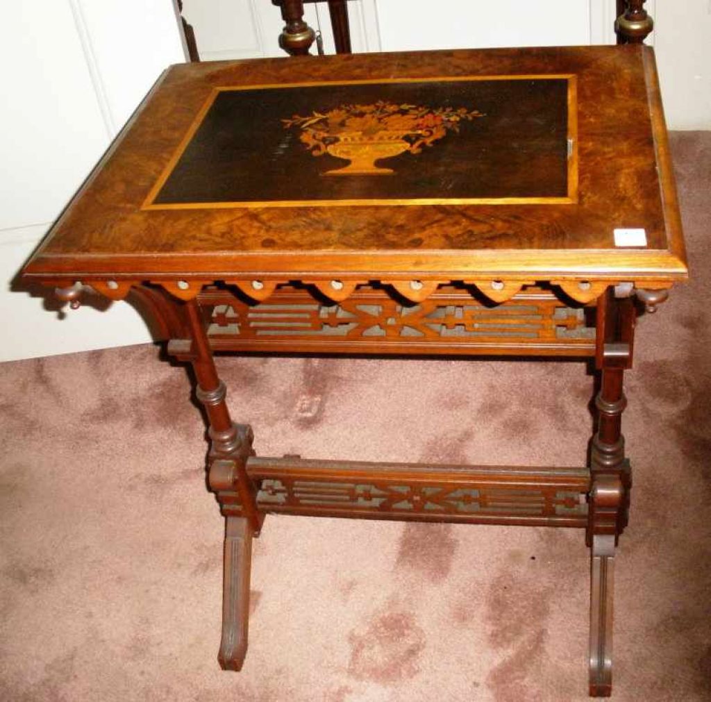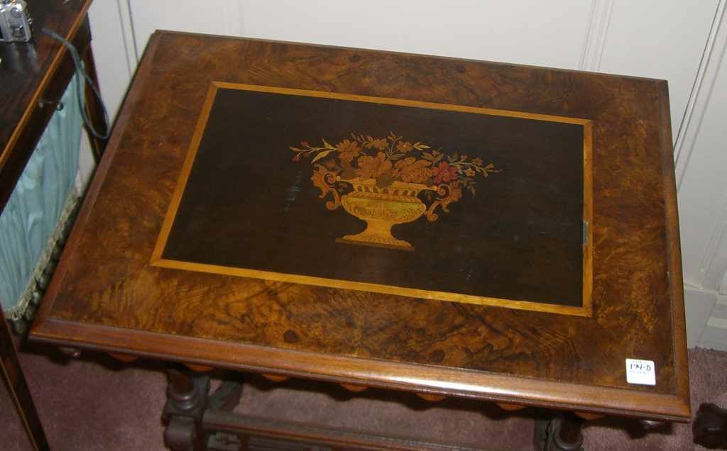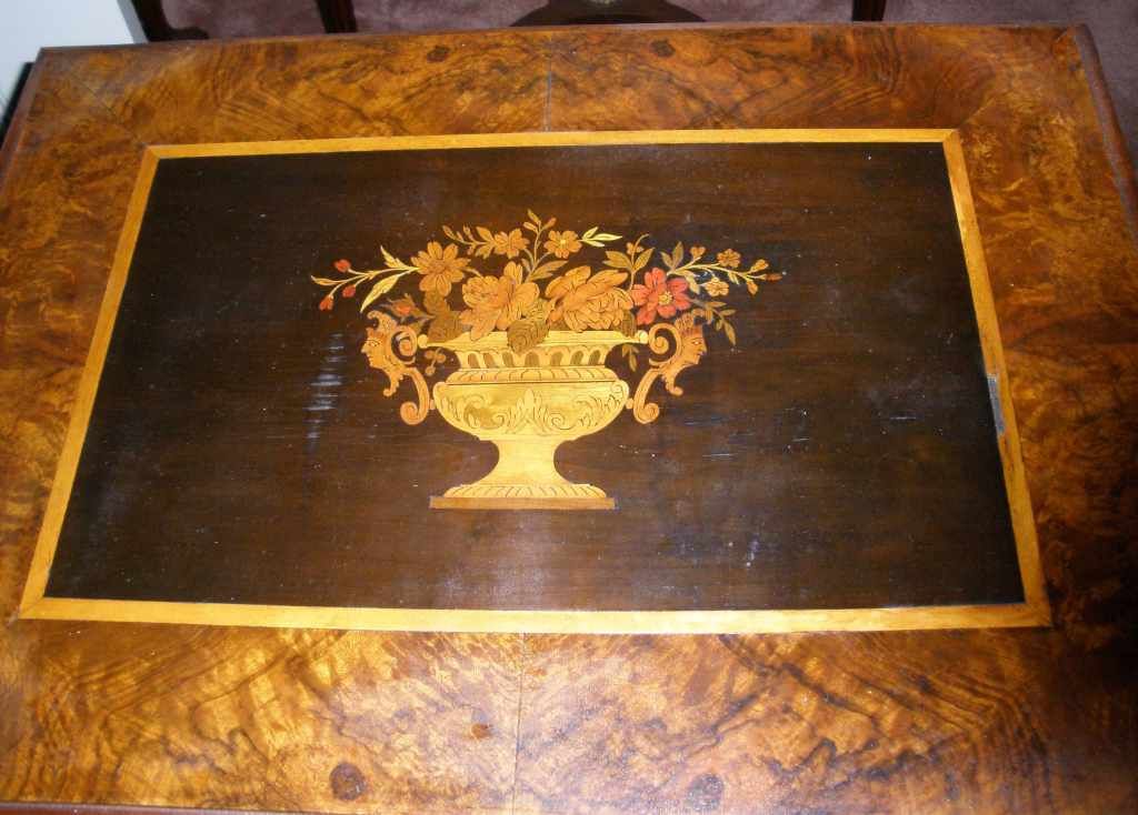 Burl walnut veneer table with marquetry inlaid urn of flowers - 29 1/4" tall by 24" wide by 17 7/8" deep Burl walnut veneer table with marquetry inlaid urn of flowers - 29 1/4" tall by 24" wide by 17 7/8" deep
