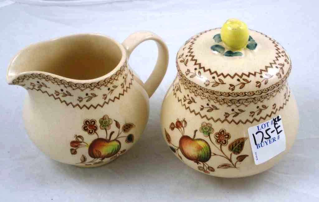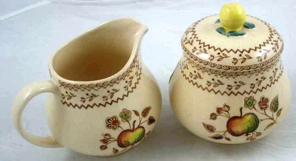England Johnson Bros. creamer & sugar with apple pattern. Subar 4 1/2" tall, creamer 4" tall England Johnson Bros. creamer & sugar with apple pattern. Subar 4 1/2" tall, creamer 4" tall