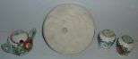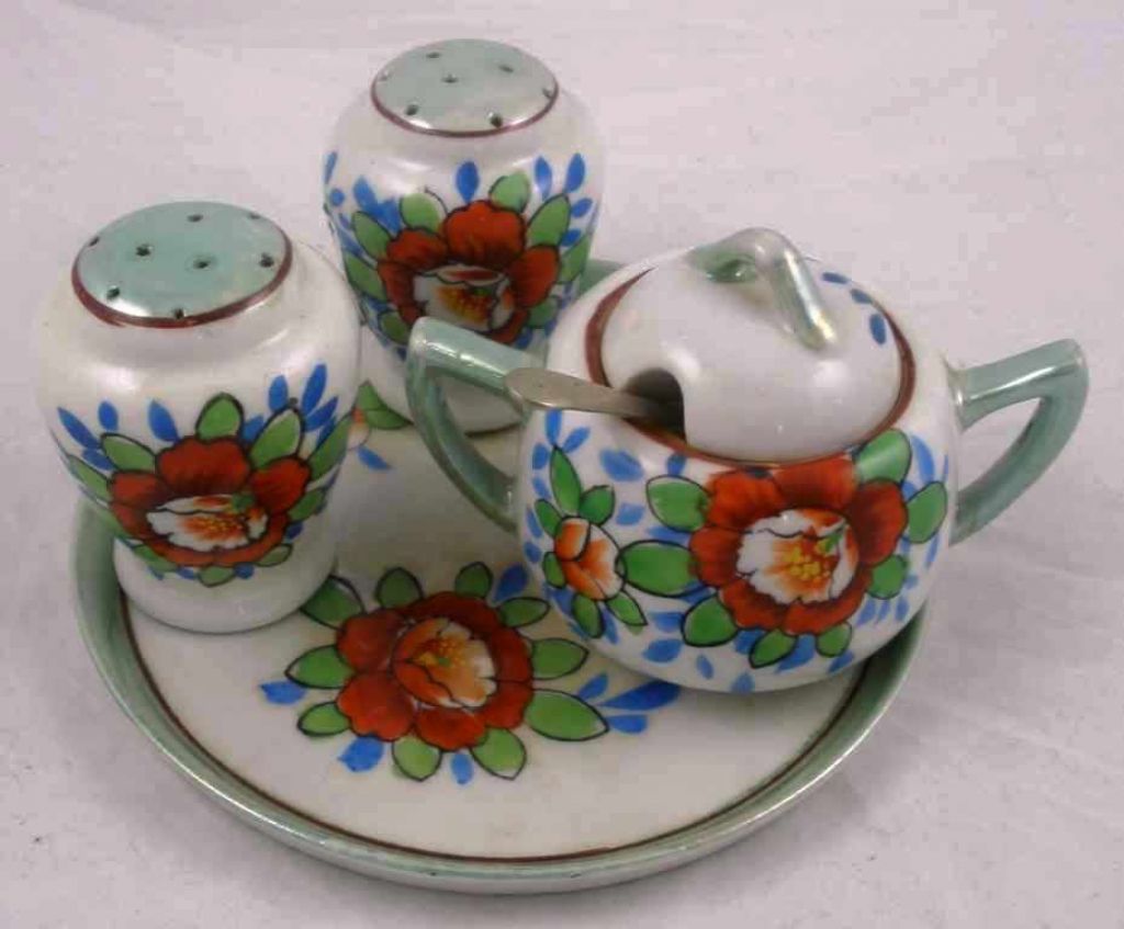 Small Japan luster ware set with flowers. Round tray, sugar bowl with spoon, salt & pepper shakers. Tray 5 1/2" round Small Japan luster ware set with flowers. Round tray, sugar bowl with spoon, salt & pepper shakers. Tray 5 1/2" round