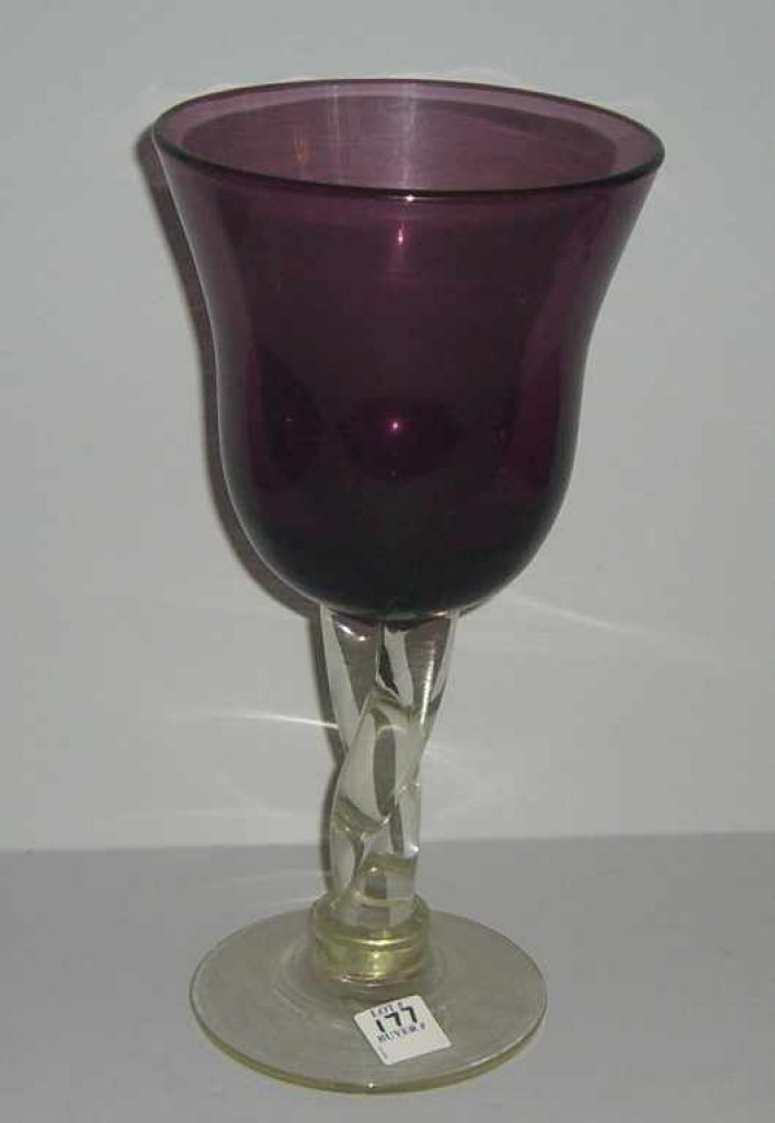 Amethyst & clear twisted stem chalice - top of chalice 6 inch diameter - base - 5 inch diameter - 12 inches tall Amethyst & clear twisted stem chalice - top of chalice 6 inch diameter - base - 5 inch diameter - 12 inches tall
