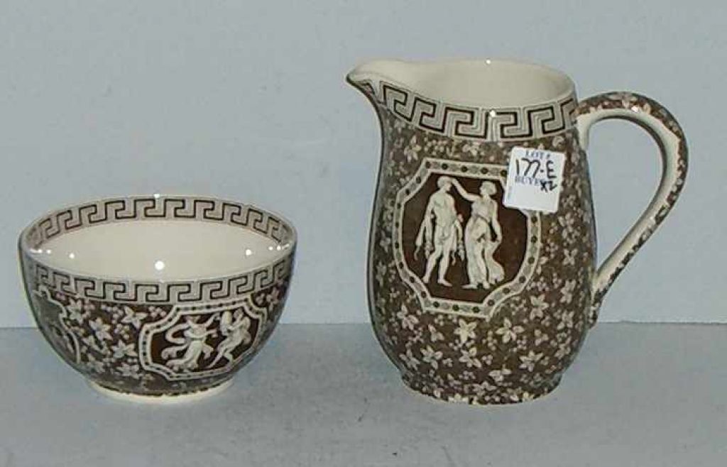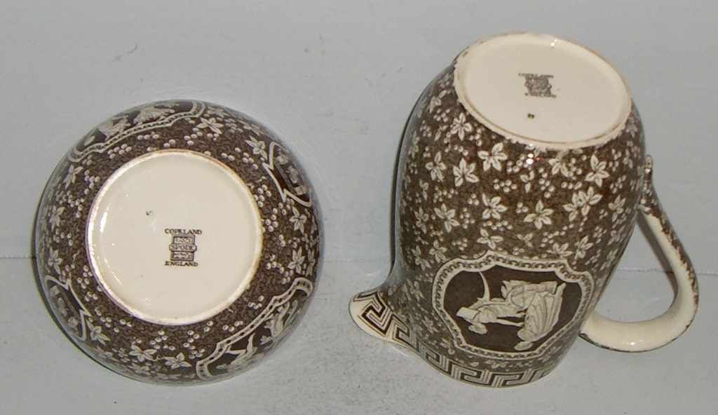 Copeland Spode creamer & sugar. Roman pattern. Creamer 5 1/2" tall, sugar 4 1/2" round x 3" tall Copeland Spode creamer & sugar. Roman pattern. Creamer 5 1/2" tall, sugar 4 1/2" round x 3" tall
