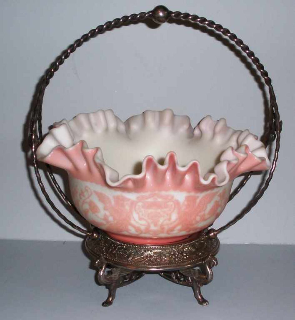 Mt. Washington cameo glass bride's basket in Wilcox silver plate frame - bowl 9 1/2" round, holder 11" tall Mt. Washington cameo glass bride's basket in Wilcox silver plate frame - bowl 9 1/2" round, holder 11" tall