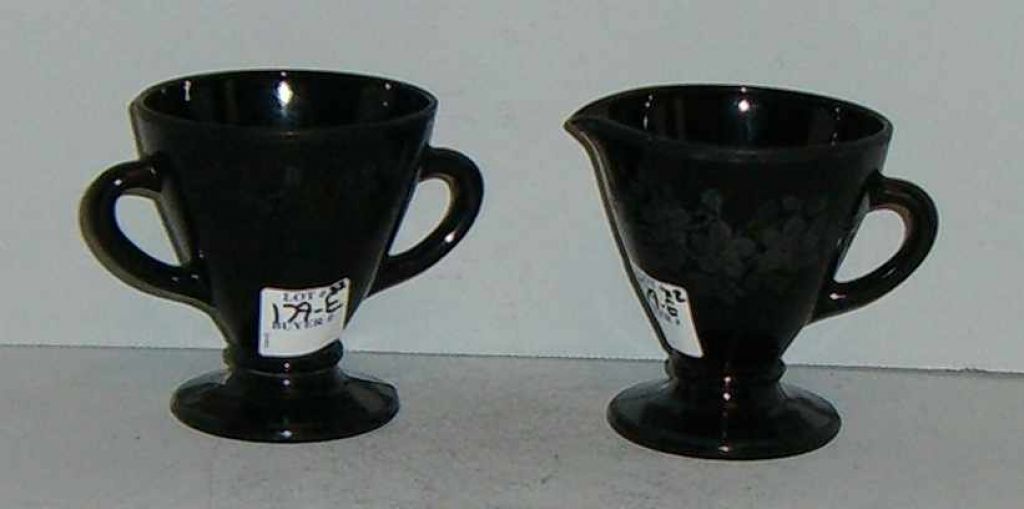 Black glass creamer & sugar silver overlay. Sugar 4" tall, creamer 4" tall Black glass creamer & sugar silver overlay. Sugar 4" tall, creamer 4" tall