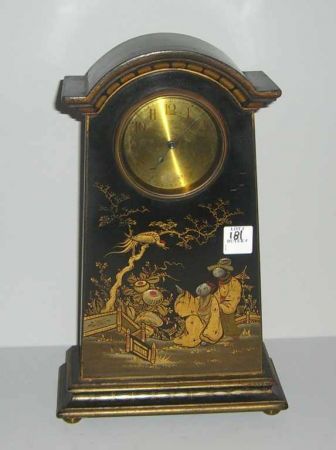 Black lacquer oriental clock - 8" width by 13 1/2" tall by 3 1/2" deep Black lacquer oriental clock - 8" width by 13 1/2" tall by 3 1/2" deep