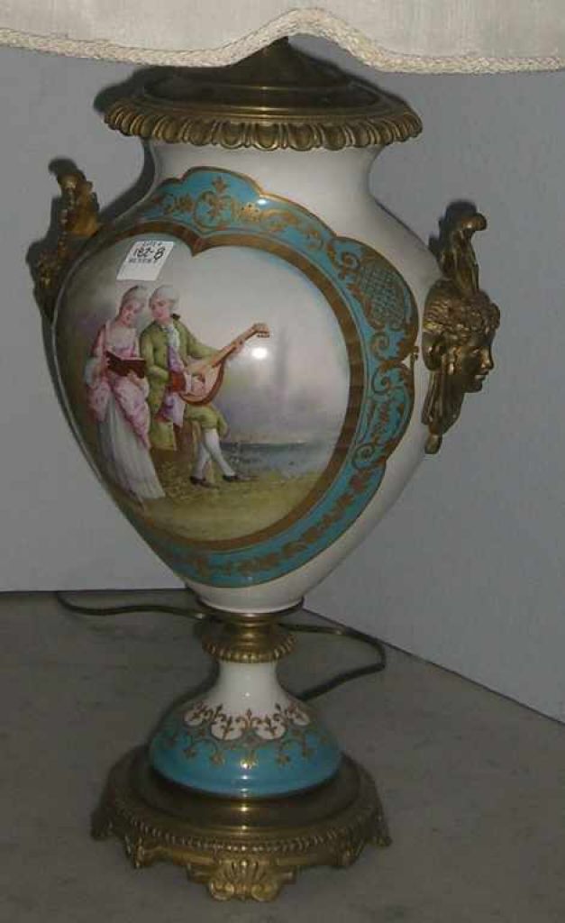 Large Sevres Hand Decorated w/Figural and Scenic Panels, Gilt Bronze Mounted w/Classical Mass on bottom of lamp - 34" tall Large Sevres Hand Decorated w/Figural and Scenic Panels, Gilt Bronze Mounted w/Classical Mass on bottom of lamp - 34" tall