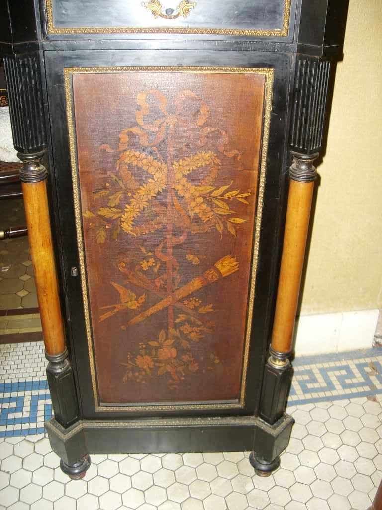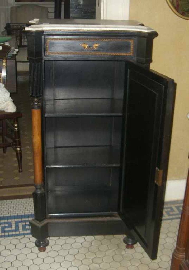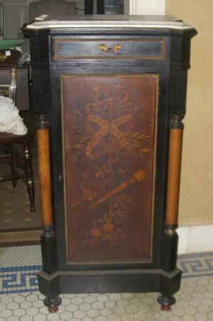 Mint julep cabinet with shaped white marble top ebonized cabinet with floral & bird marquetry inlaid in door - 44" tall by 22" wide by 15" deep Mint julep cabinet with shaped white marble top ebonized cabinet with floral & bird marquetry inlaid in door - 44" tall by 22" wide by 15" deep