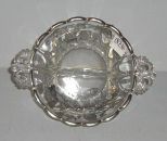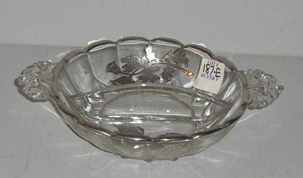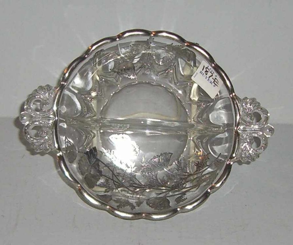 Double Handle Divided Nut Bowl with Sterling Overlay. 8" length x 6" width x 2" height Double Handle Divided Nut Bowl with Sterling Overlay. 8" length x 6" width x 2" height