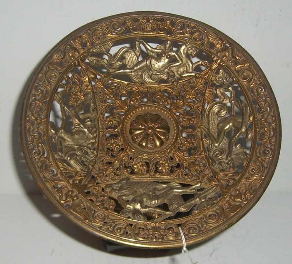 Brass Open Carved Compote with Figures. 7" round x 6" tall Brass Open Carved Compote with Figures. 7" round x 6" tall