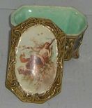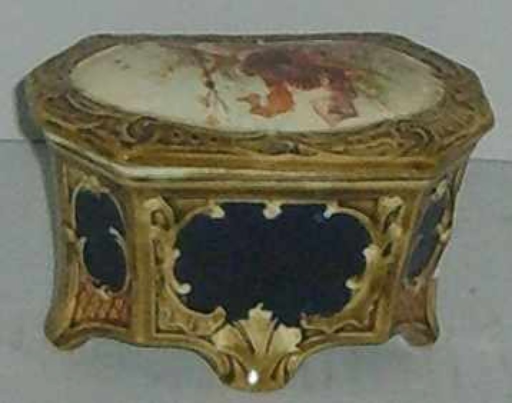 Majolica Victorian Continental Covered Dresser Box, Figural Scene w/Cobalt Medallions. 3" width x 4 1/2" length x 3" height Majolica Victorian Continental Covered Dresser Box, Figural Scene w/Cobalt Medallions. 3" width x 4 1/2" length x 3" height