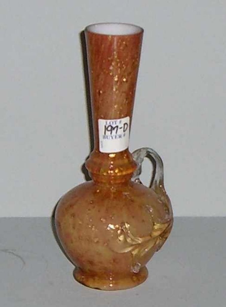Art glass vase with gold flakes and clear applied handle - 3 1/2" round by 8" tall Art glass vase with gold flakes and clear applied handle - 3 1/2" round by 8" tall