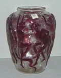 Consolidated clear vase with drilled bottom with nude dancing ladies, ruby stained base - 8" round by 12" tall Consolidated clear vase with drilled bottom with nude dancing ladies, ruby stained base - 8" round by 12" tall