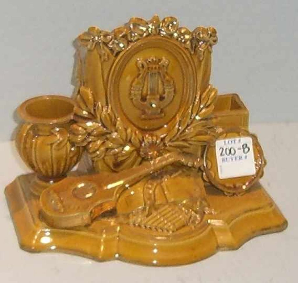 Majolica Cigar and Match Holder w/Musical Instruments. 4" width x 7" length x 6" height Majolica Cigar and Match Holder w/Musical Instruments. 4" width x 7" length x 6" height