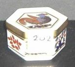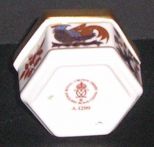 Royal Crown Derby covered hexagon box rooster design - marked Royal Crown Derby English Bone a 1299 - 2 1/2" wide x 2 1/2" deep x 1" tall Royal Crown Derby covered hexagon box rooster design - marked Royal Crown Derby English Bone a 1299 - 2 1/2" wide x 2 1/2" deep x 1" tall