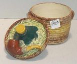 Majolica-Schiller Humidor, Figural Wine Bottle w/Pipe. 5" round x 6" tall Majolica-Schiller Humidor, Figural Wine Bottle w/Pipe. 5" round x 6" tall