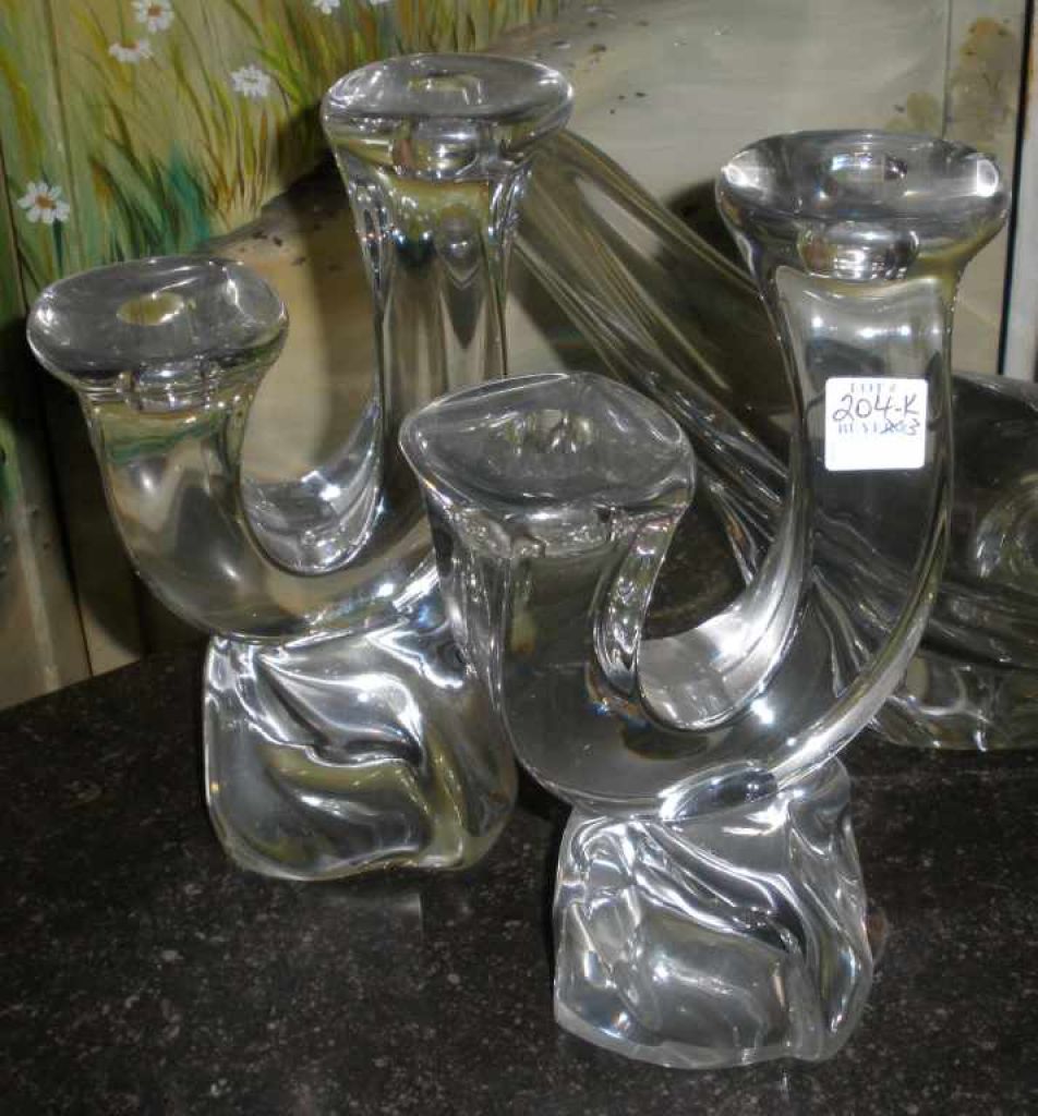 3 pc Daum France set center bowl with pair of side candlestick holders - center bowl is 23" by 5" by 5", candleholders are 7" by 5" by 9" 3 pc Daum France set center bowl with pair of side candlestick holders - center bowl is 23" by 5" by 5", candleholders are 7" by 5" by 9"