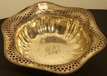 Sterling silver pierced monogrammed bowl w/beaded border - R. W. (deerhead symbol) & S. - 11" diameter Sterling silver pierced monogrammed bowl w/beaded border - R. W. (deerhead symbol) & S. - 11" diameter