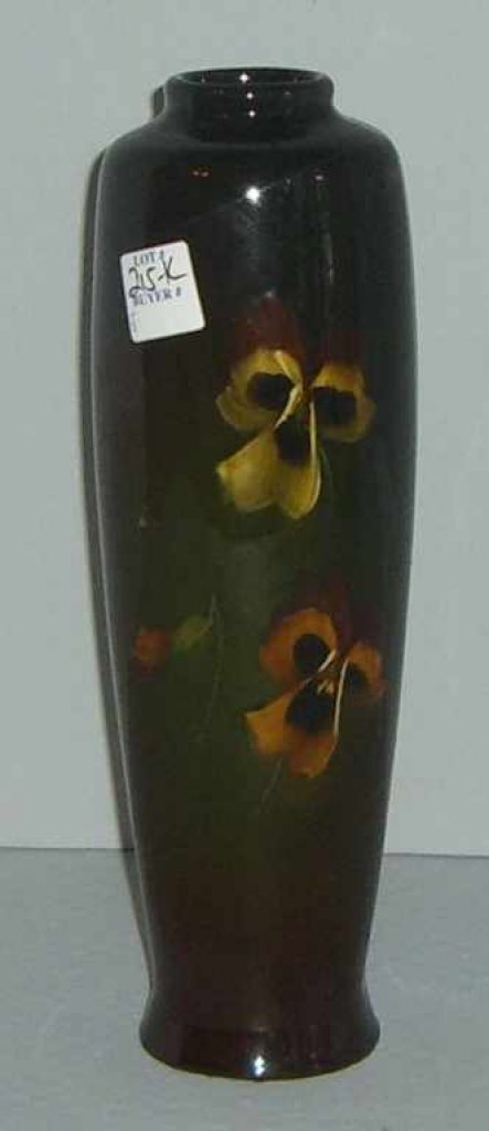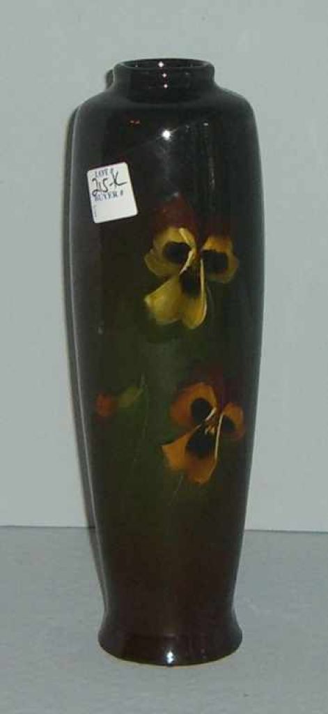 Black vase with glazed over white & brown flowers - 4" round by 12" tall Black vase with glazed over white & brown flowers - 4" round by 12" tall