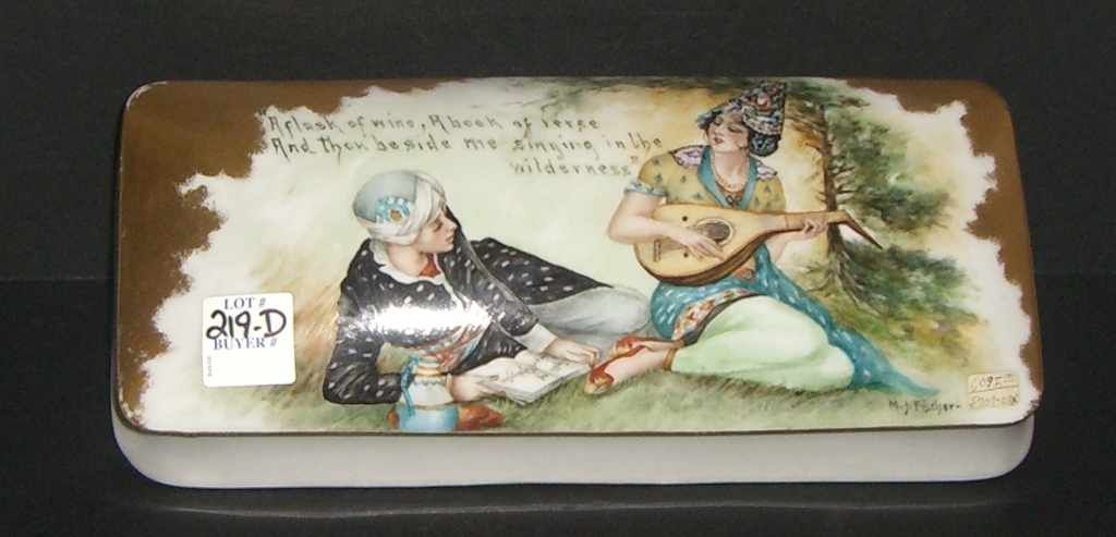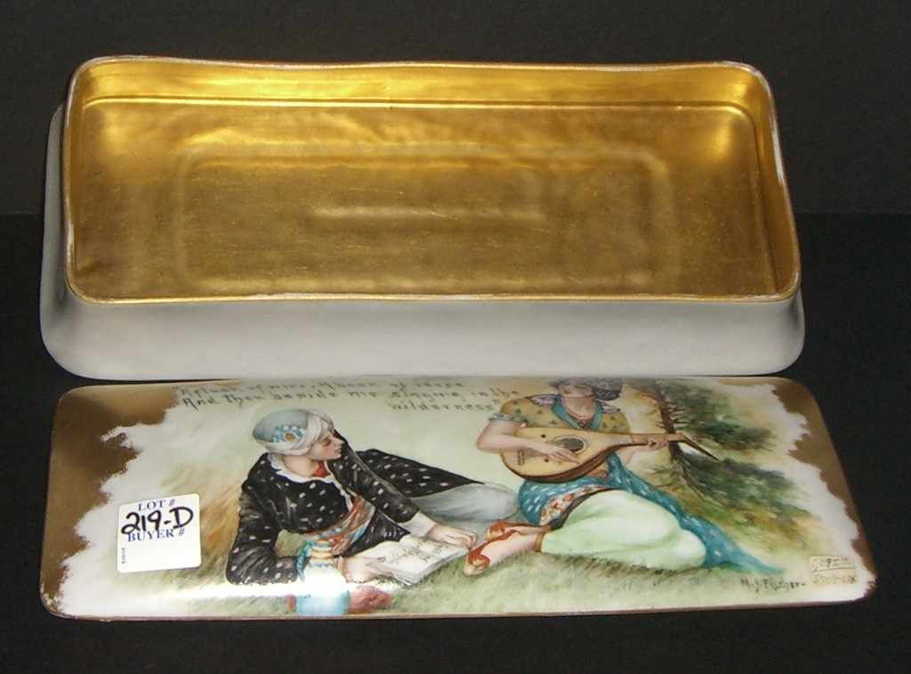 Hand painted covered Bavaria box signed by M J Fischer. 10 1/2" length by 4 1/2" width by 2 1/2" tall Hand painted covered Bavaria box signed by M J Fischer. 10 1/2" length by 4 1/2" width by 2 1/2" tall