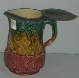 Majolica syrup pitcher metal lid green, yellow, & red colors - 7 1/2" tall Majolica syrup pitcher metal lid green, yellow, & red colors - 7 1/2" tall