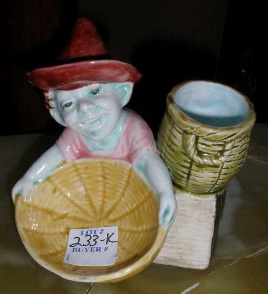 Majolica farmer boy match holder - 4 1/2" wide by 4 1/2" deep by 4 1/2" tall Majolica farmer boy match holder - 4 1/2" wide by 4 1/2" deep by 4 1/2" tall