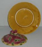 2409 Sarreguemines Majolica France covered pancake dish with strawberries