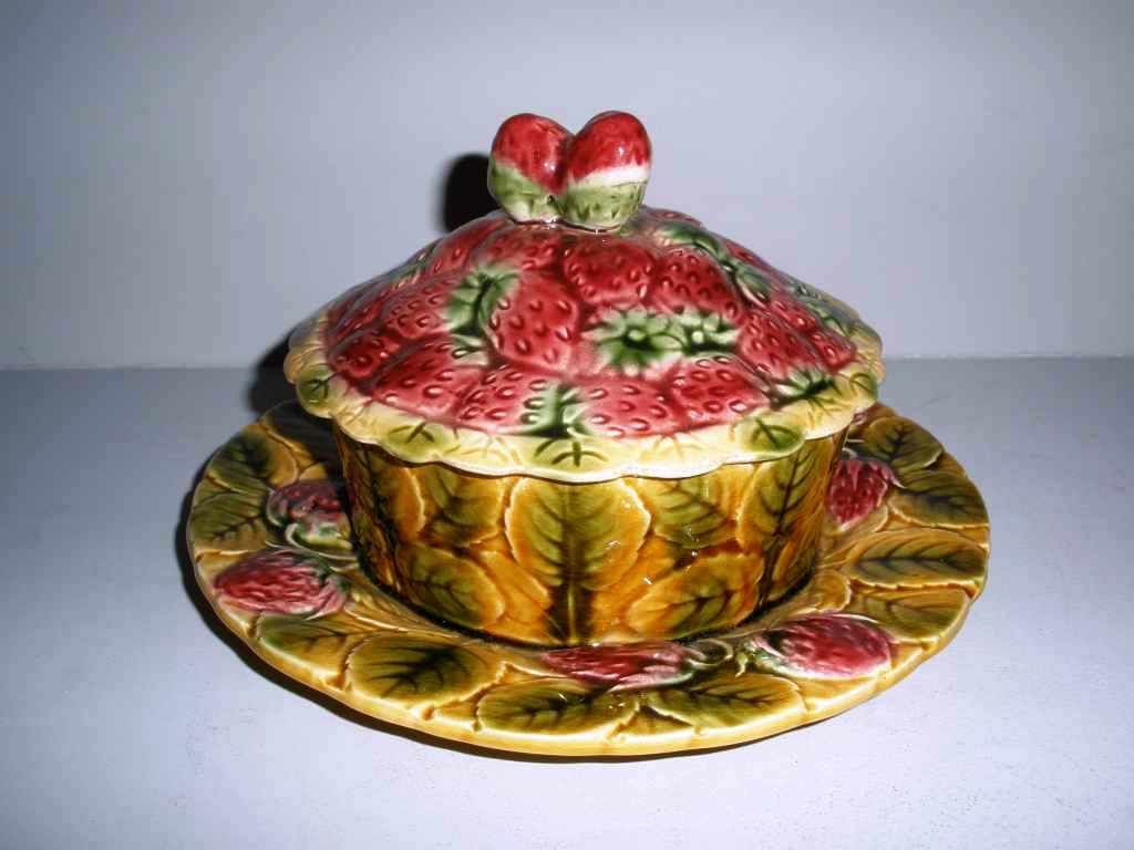 Sarreguemines Majolica France covered pancake dish with strawberries - 7" round by 5" tall Sarreguemines Majolica France covered pancake dish with strawberries - 7" round by 5" tall