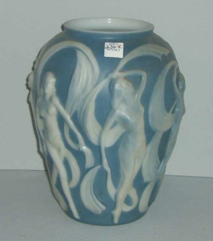 Phoenix dancing nude ladies blue & white vase - 8" round by 12" tall Phoenix dancing nude ladies blue & white vase - 8" round by 12" tall